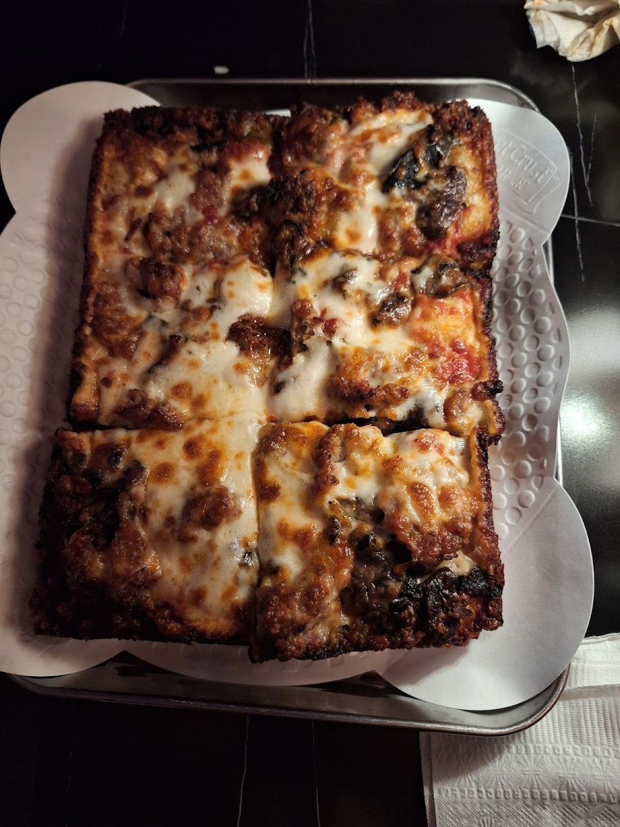 Got my order to go, so I didn't rate service or atmosphere. The cheese sticks and pizza were phenomenal. Crispy on the outside with nice chew on the crust. Great Detroit style pizza.